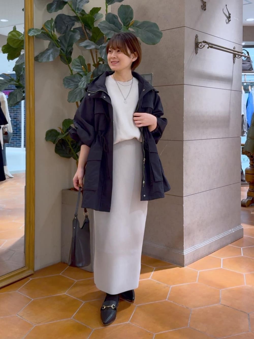 ・アウター 大きめのフードがかわいいマウンテンパーカーです。マットなさらっとした質感でカジュアルにもキレイめにも合わせやすいアイテムです。 ウエスト部分にドロストがついており、ぎゅっと絞ってウエストマークすることも可能。 下半身の気になるところをカバーしてくれるミドル丈で、パンツにもスカートにも合わせやすい一枚です。 ・ニット スムース編みのきれいな表面ともっちりした風合いが特徴のニットです。コットン100%で膨らみがあり、優しい肌触りなのでウールニットが苦手な方におすすめなアイテムです。 つまり過ぎないクルーネックや、丸みを帯びたバックテールデザインなど着るだけでキレイに見えるように細かなバランスにこだわった1着です。 ・スカート 36サイズ着用。 やわらかく肌触りのいい素材感のニットスカートです。きれいな表面ともっちりした風合いが特徴です。ストレッチ性も高く、着心地の良さ・歩きやすさも◎体のラインを拾いすぎないのにすっきりときれいなシルエットで着ていただけます。 36サイズでくるぶし下くらいの着丈です。
