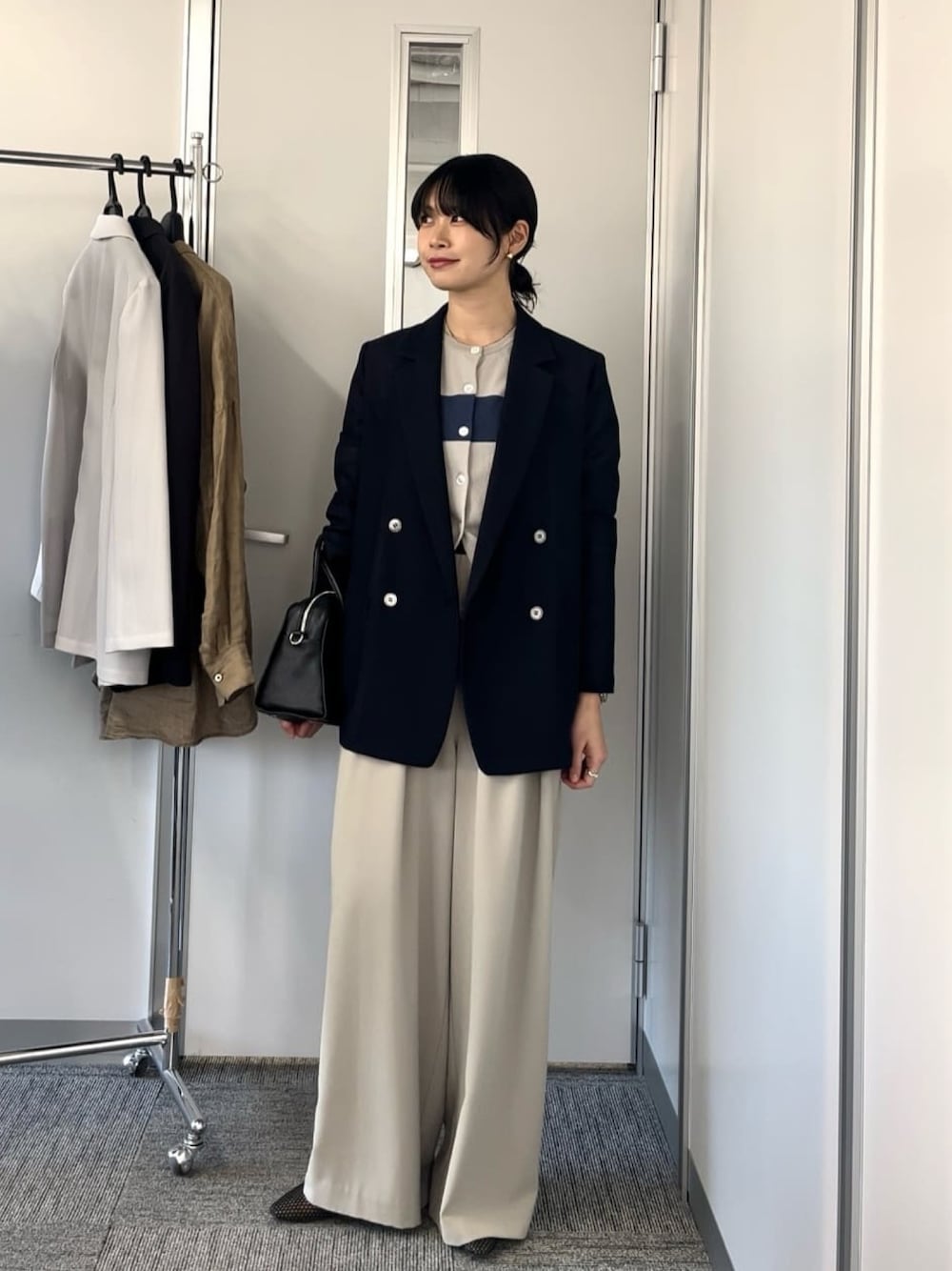 ジャケットを使ったオフィスコーデ メッシュ素材のジャケットはネイビー着用。 通気性があって夏まで長く着回せます。 セットインのジャストなサイズ感なので、窮屈感は無くすっきり見える絶妙なシルエットです。 カーディガンはセットインで肩幅ジャストに着れて、身幅はフィットしすぎないため窮屈感なく着て頂けます。 生地はしっかりしていますが、サラッとした素材感なので快適な着心地です。 パンツは38サイズ着用。写真だと色が薄く出ていますが、実際はもう少しグリーンの色味があります。 着丈長めなので36サイズがマイサイズ。38だとフラットシューズでは裾がついてしまうため1つ折り返して履くことが多いです。