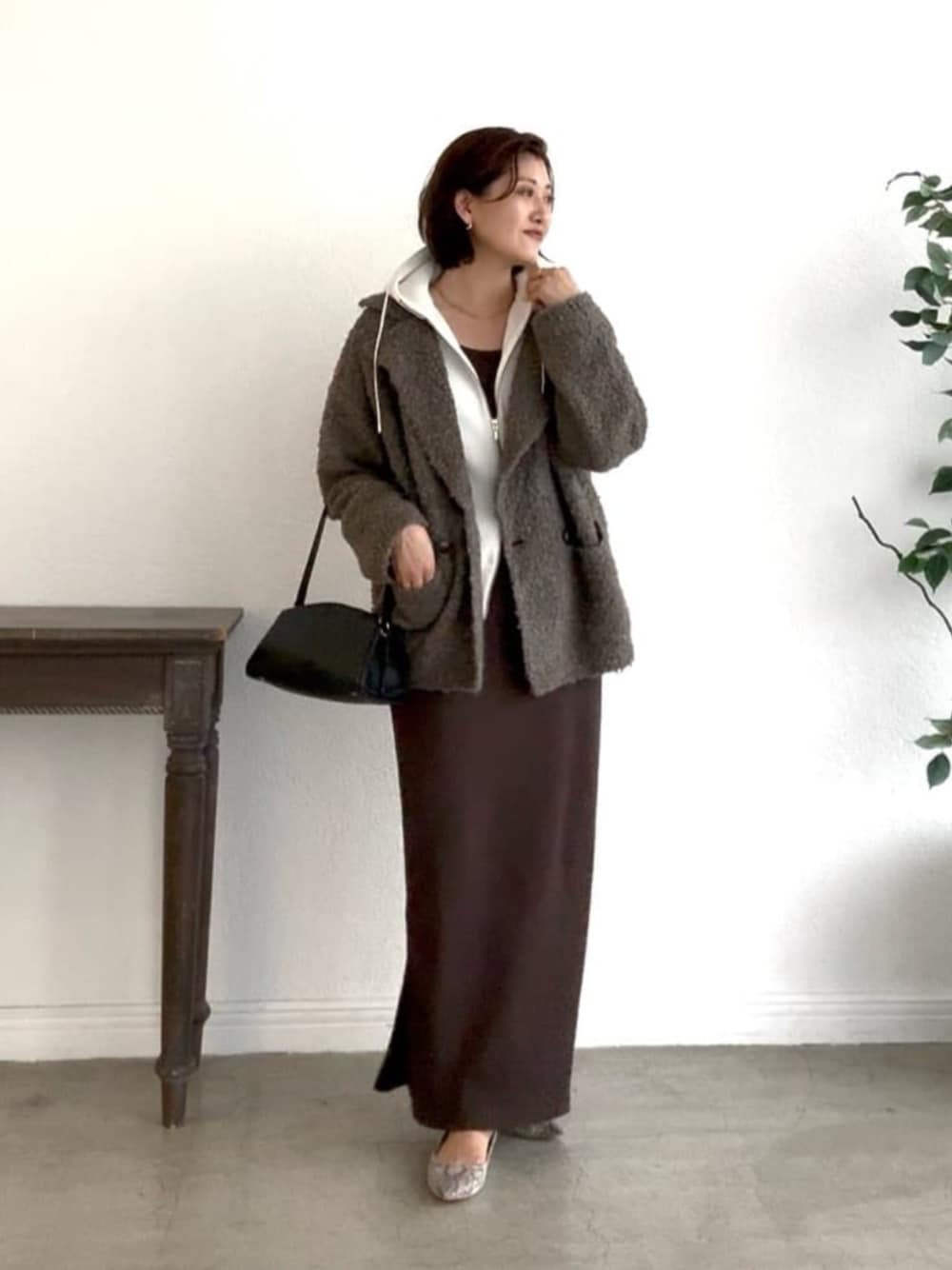 ノースリワンピにパーカーの綺麗めカジュアルコーデに、ふわふわコーディガンを合わせた秋冬コーデ◎ 【コーディガン】 ボアなのに落ち感があるのですっきりと着られます◎柔らかくとにかく軽い!アウターとしても、カーディガンとしても♪ 【パーカー】 コンパクトなシルエットのきれいめパーカー。 ゴールドジップで上品見えします。 【ワンピース】着用サイズ:40サイズ ノースリタイプのリブワンピース。 タイトシルエットで細見え効果抜群! 秋冬も重ね着スタイルで楽しめます◎
