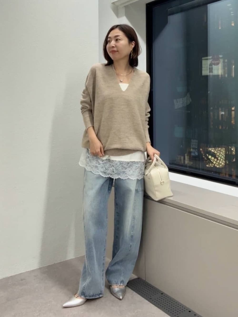 ●ニット 大人気のバックボリュームニット。薄手なウール素材で長いシーズン使える一枚。シャープなVネックも人気ポイントです。 ●インナー サテン素材のレースキャミ。シーズンレスにレイヤードコーデが楽しめます。 ●パンツ 38サイズ着用。ウエストはやや余裕あり。160cmで着丈も長めでした。シンプルトップスも鮮度の上がるシルエットです。