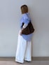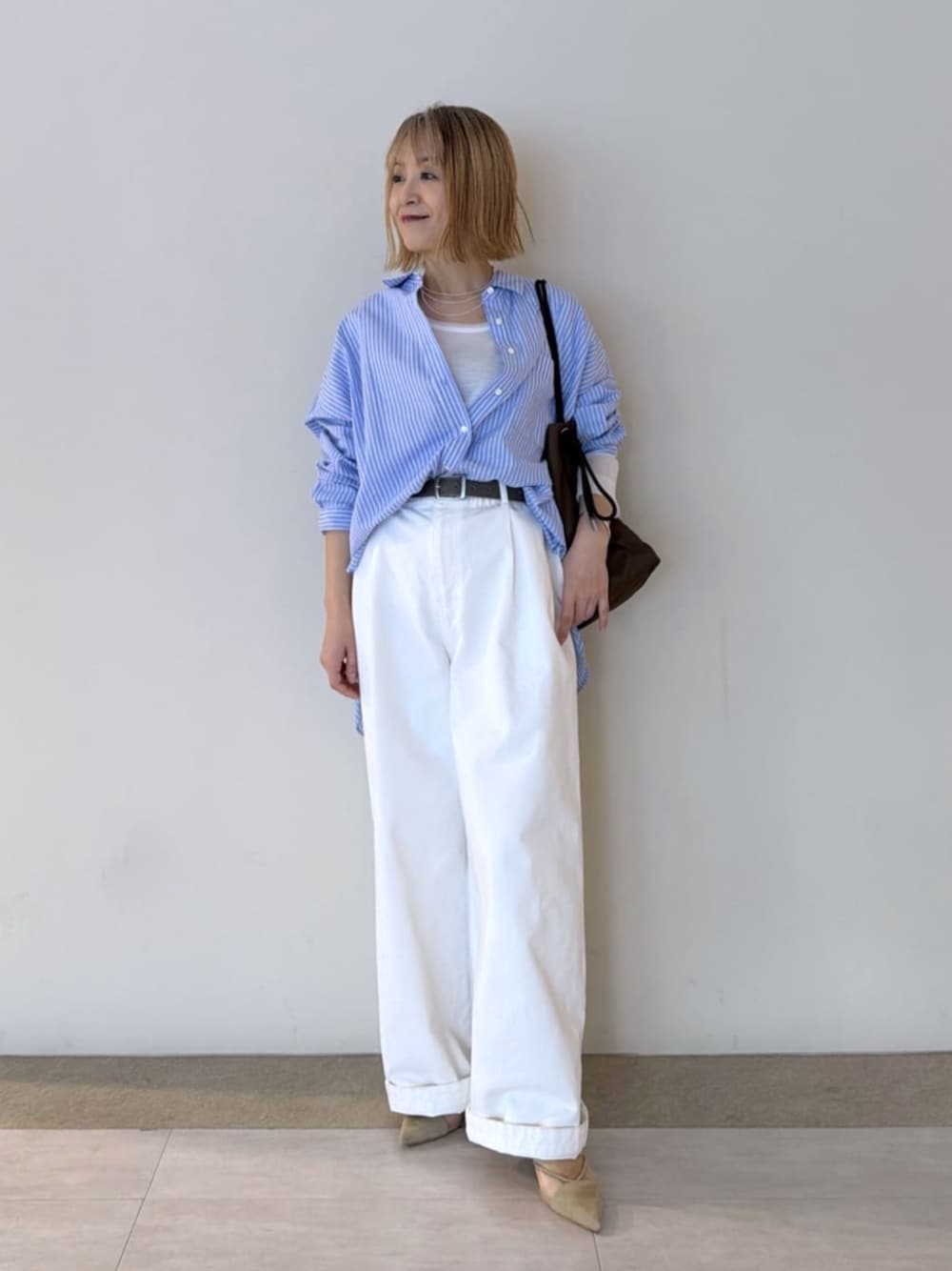 コットンとセルロースの混紡素材で薄手で柔らかく、ゆったりシルエットですがもこもこせず スッキリ着られるシャツです。 春らしく爽やかに、インナーとボトムは白でまとめて、脚長効果を狙ってベルトもチラ見せ。 こちらのベルトもインフルエンサーコラボ(こちらはSHIHOさん監修)です☺︎