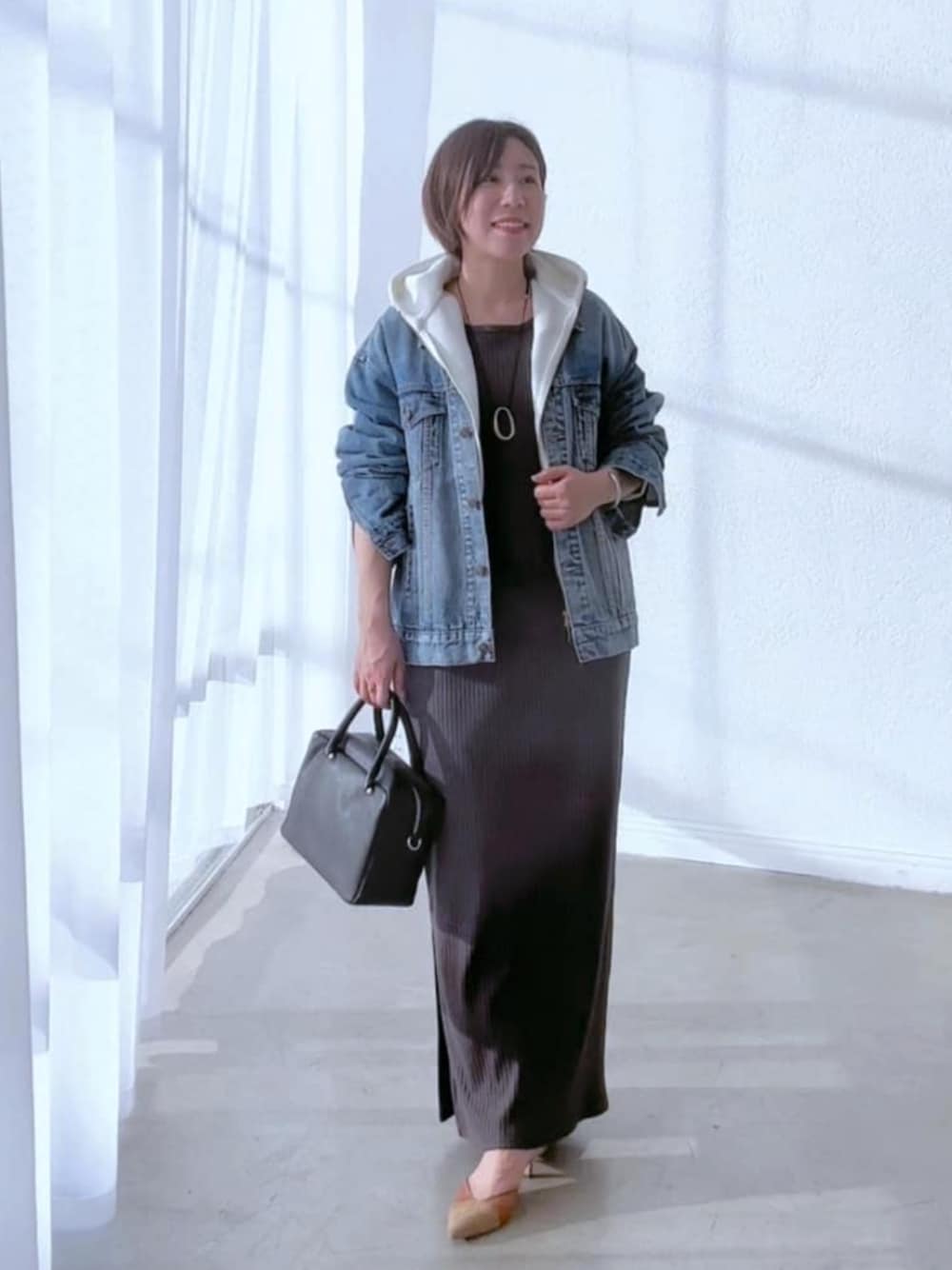 すっきり見えで定番人気のワンピース。 程よい厚みがあるのでボディのラインを拾いすぎずすっきり着れます。 シンプルなデザインだからこそ、幅広いアイテムと合わせやすいのも嬉しいポイント♪ アウターはこちらも人気のデニムジャケット。 程よくオーバーなサイズ感で羽織るだけでこなれ感抜群! 中にパーカーをレイヤードして大人カジュアルにしました。