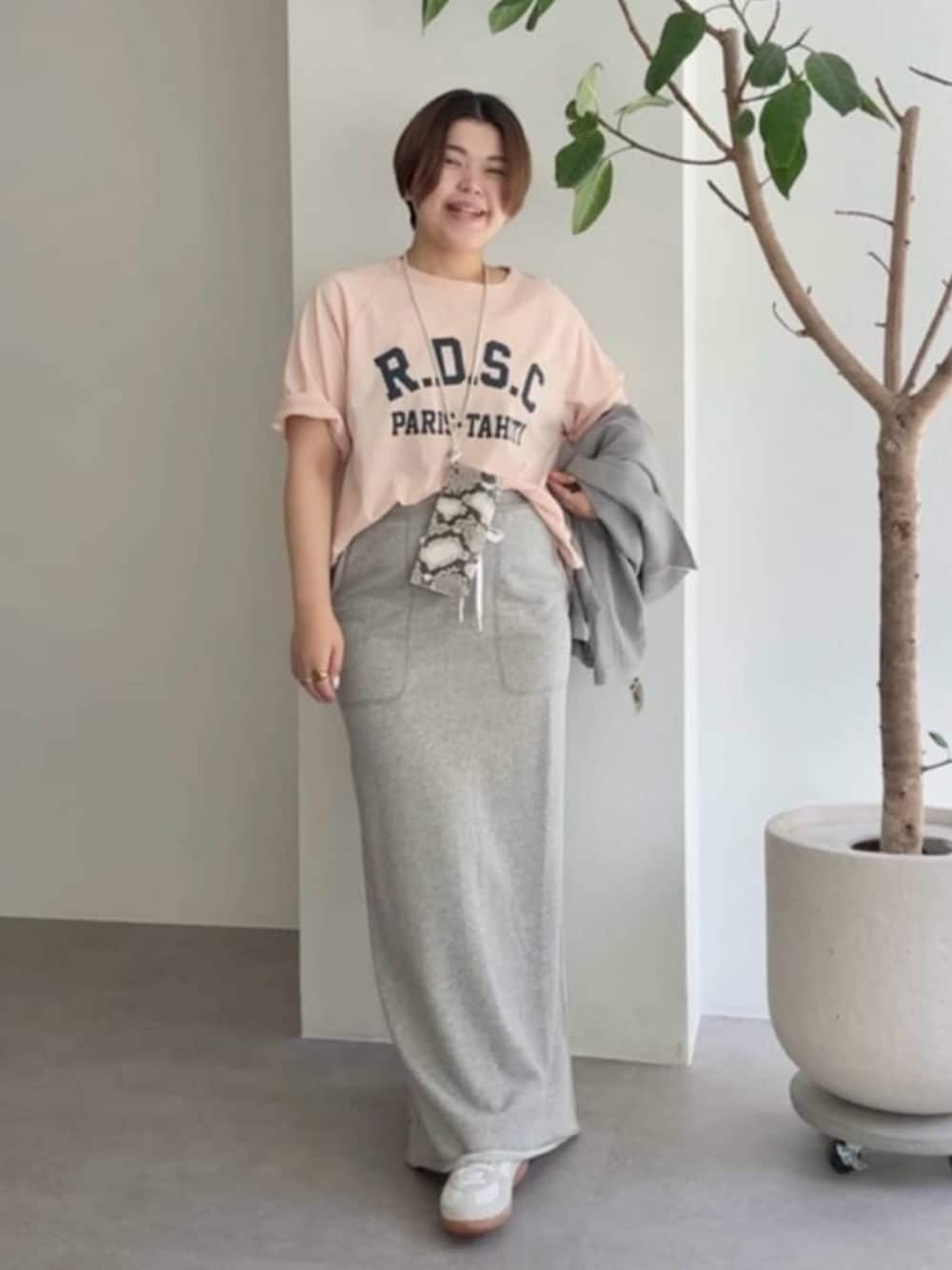 春コートのインナーや夏の一枚着コーデにぴったり! ピンク×グレーの鉄板カジュアルコーデ!