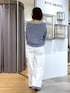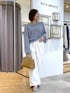 【トップス】Fサイズ/ブルー ・色のミックス感が可愛らしい、ざっくりとした編地のプルオーバー。 ・和紙に光沢のあるファンシーヤーンを撚糸することで、独特の質感を生み出しています。 ・かさ高性がありながら軽くて落ち感もあるため、着やせして見えるのも嬉しいポイントです。 ・ホールガーメント編みで縫い代がなく、ストレスフリーな着心地を実現。 【パンツ】38サイズ / ホワイト ・タック入りのワイドシルエットでラフな印象で快適な履き心地 ・裾は折り返しても履きやすいように別出し見返しの仕様に ・ウエストゴムでイージーな履き心地 ・ウエスト部分にはベルトループをつけておりベルトを合わせたスタイリングもおすすめ