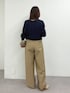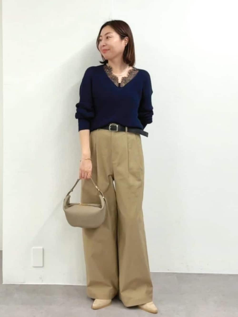 ●ニット ネイビー着用。品よく見えるレースデザイン。すっきり着れるシルエットです。 ●パンツ ベージュ38サイズ。美シルエットなチノバギー。カジュアルすぎない素材感も魅力です。 ◎春のチノパンツコーデ。ネイビーのレースニット合わせでシンプルカジュアルに。