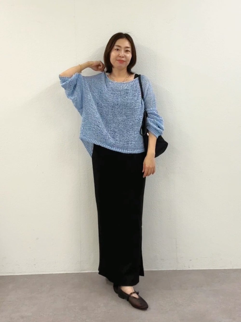 ●ワンピ ブラックFサイズ着用。ハリのある体型カバーにもぴったりなワンピ。着心地も抜群です。 ●ニット 夏も着れるシアーニット。スカートもパンツにも合わせやすいシルエットです。 ◎ワンピとニットのレイヤードコーデ。カラーを主役に。