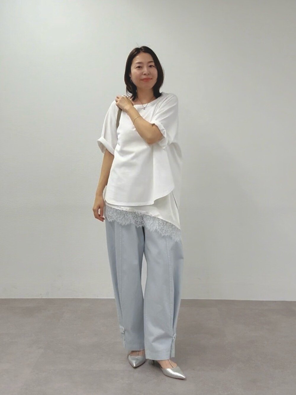 ●カットソー 好評なヨッシーさんコラボTシャツに無地バージョンが登場しました! 肌触りのいい素材感はそのまま、無地なのでカジュアルすぎずに使えます。 ●パンツ 38サイズ着用。デザインシルエットのワイドパンツ。裾のボタンでカーブラインにも!適度にハリがあり、体型カバーにもよいです。 ◎白Tをきれいめカジュアルコーデに。ブルーボトムとレース合わせで清涼感をプラスしました。