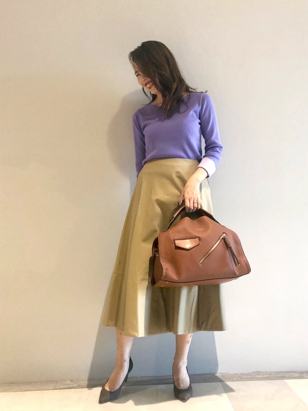 いつもご覧いただき、ありがとうございます!! 秋の始まりには 大人可愛い、きれい色を。 チノスカートでカジュアルダウンしつつ スエードパンプスで品良く。 コーデを優しくまとめるブラウン小物👜は 色のトーンに変化をつけて こなれ感を楽しんで。🎻🕰📔🍂