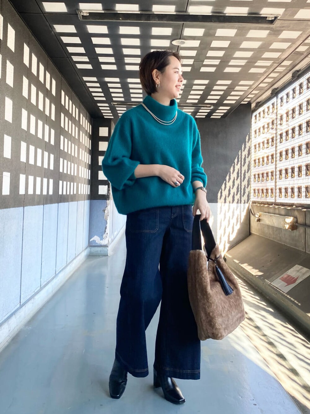 いつもご覧いただきありがとうございます✨ グリーンのニット×デニムの ワントーンコーデ🫐👖🧢 ファーバッグをポイントに♡