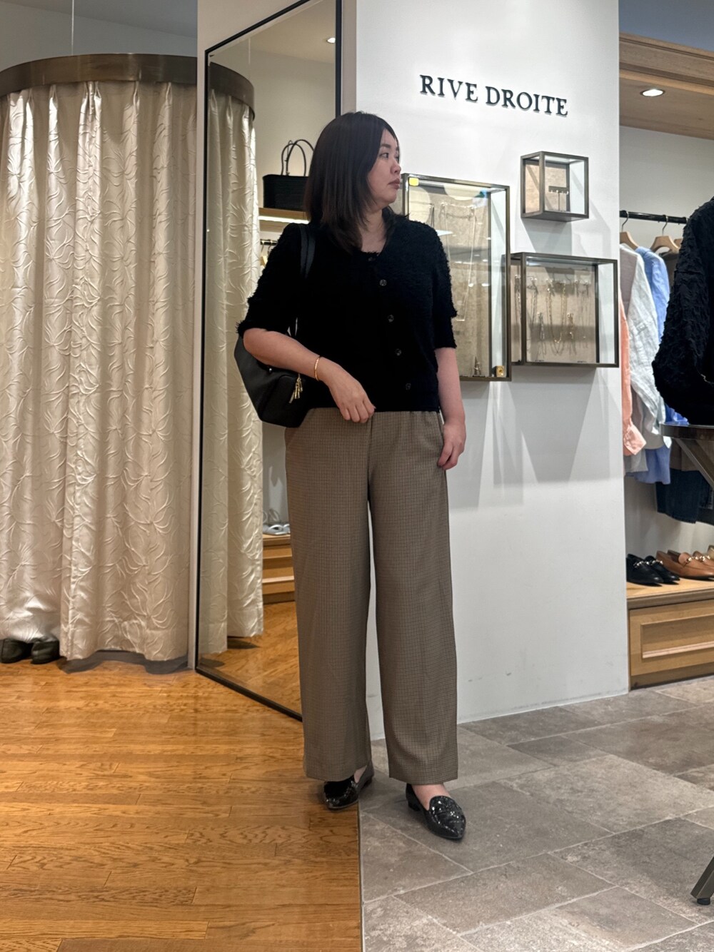 トップスのカーディガンは、ふわふわっとしたシャギーで、柔らかくて軽さも○ インナーは、襟ぐりのチュールがポイントになるデザイン。 パンツは、ガンクラブチェックが秋のスタイリングにもピッタリ。 ウエストがゴム仕様で、着心地が○ パンツ/38サイズ
