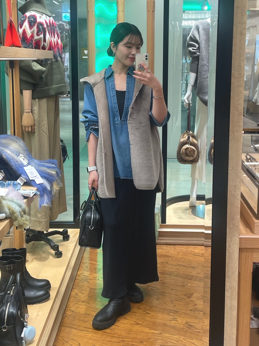 リブタンクワンピースは秋冬も着られます! ノースリーブなので重ね着もしやすいです◎ デニムシャツとジレをレイヤード♡ ジレはふわふわで肌触り滑らか。 すとんと落ちるので膨らんで見えないのもポイント!