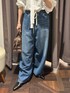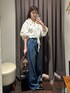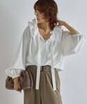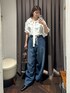 ブラウスは、衿元のギャザーフリルがポイントのブラウス。 コットンのようなナチュラルな表情感と風合いがあり、さらっとした肌触りが特徴です。 ボリュームのあるシルエットが1枚で着映えし、シンプルなスタイリングも様になる一着です! 襟元のフリルデザインはドロスト紐で自由自在にアレンジ可能。 シワになりにくく、ご自宅で簡単にお手入れ可能です デニムは、暑い夏でも涼しく着用いただけるルーズシルエットのデニム。 トレンド感のあるコットンコードのドロストベルトが目を引くデザインです。 ウエストの紐はベルトの裏にしまえる2WAY仕様です! リブニットやコンパクトなカットソーとのスタイリングはもちろん、 ジャケットや長めの丈のシャツとルーズなバランスで着こなすのも〇