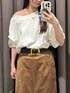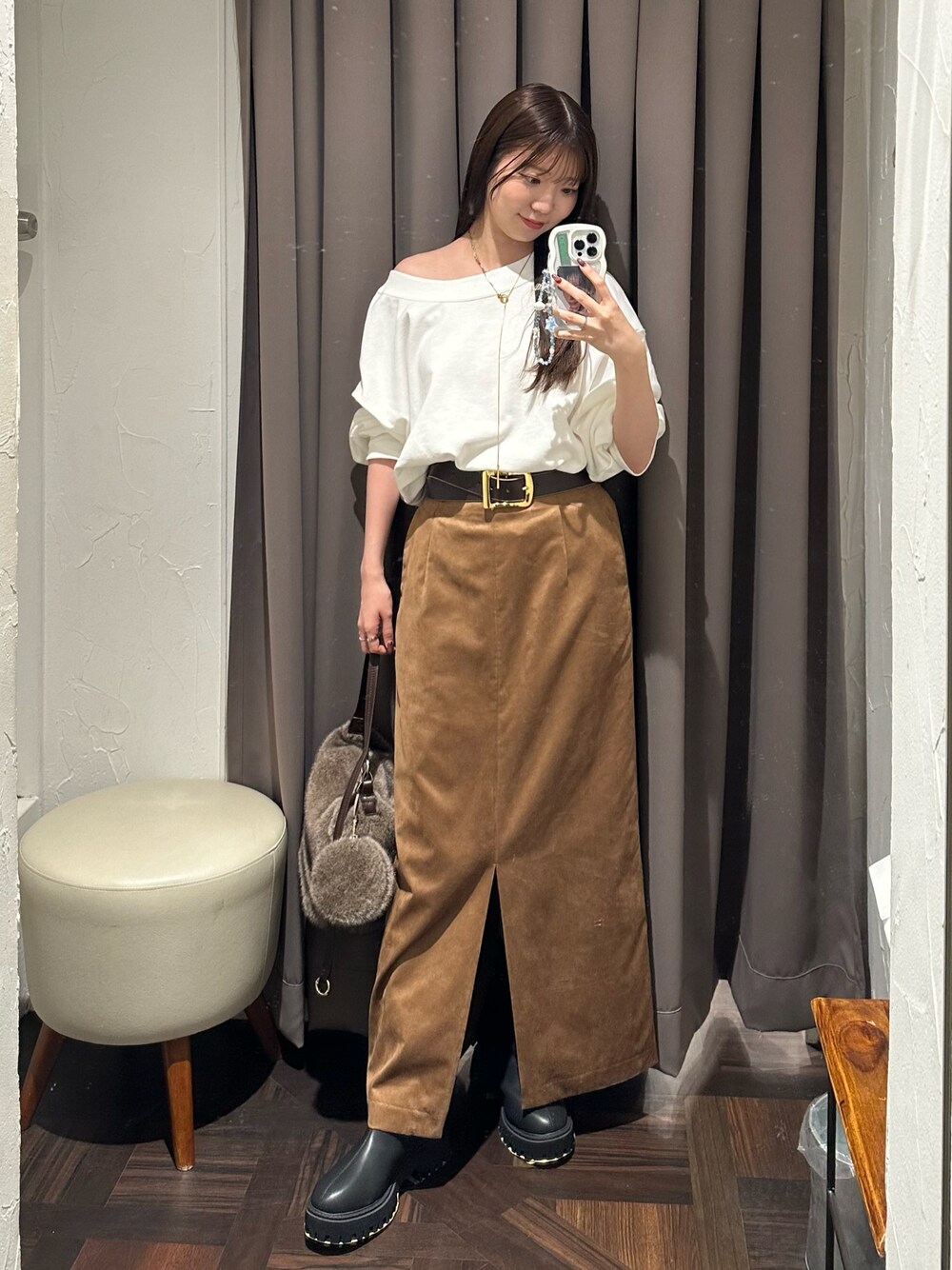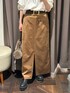 トップスは、薄手で柔らかさのある裏毛素材を使用した、前後2wayで着用いただけるスウェット。 ボートネックとVネックでの衿ぐりで、印象を変えて着用いただけます。 ゆるっとした衿の空き具合で、片側の肩を落として抜け感を出していただくのもおすすめ。 身幅や袖はたっぷりと作っていますが、袖口と裾をコンパクトにし、女性らしいフォルムで着用可能。 タイトスカートなどのすっきりしたシルエットのボトムはもちろん、 ボリュームのあるボトムともバランスよく着用いただけるアイテムです。 スカートは、今季トレンドのスエード風素材を使用したシーズンムードを感じられるアイテム 独特のタッチと品の良い色合いでキレイめな印象ながら、カジュアルなアイテムとも好相性。 フロントスリットで抜け感もプラス。足さばきも良く安心して着用いただけます