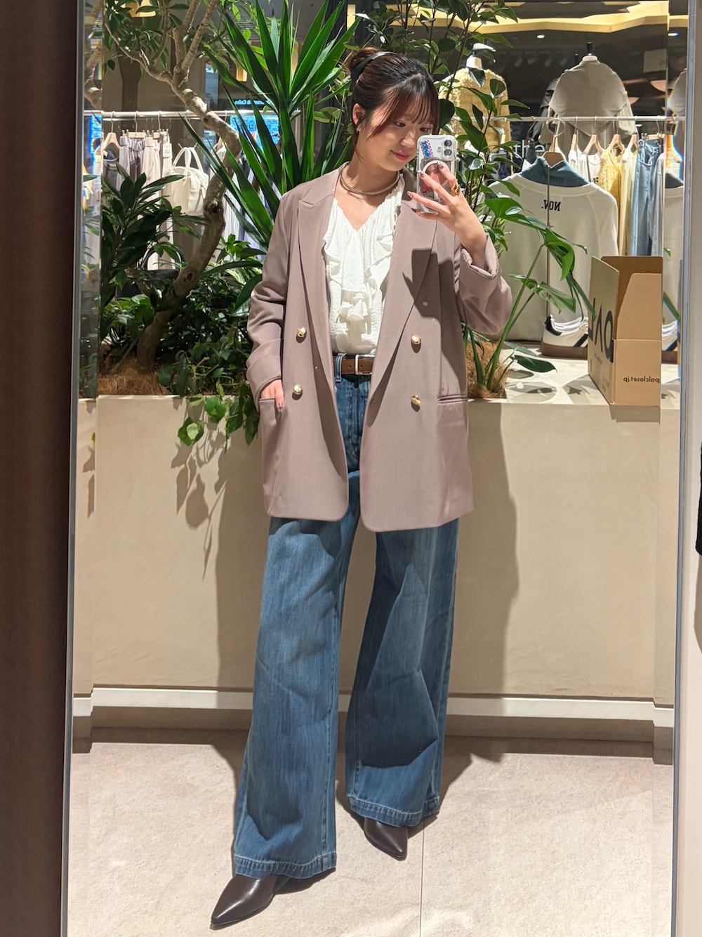 パンツは、程よいワイド感でとても合わせやすいです!生地感が軽く履きやすいのも嬉しいポイント! トップスは、衿ぐりと袖のフリルディテールが華やかな着映えブラウス 衿をV開きにすることで甘くなりすぎないです! 素材の表面感があるので、デニムなどと合わせたカジュアルなスタイリングにも馴染みよく、 オンオフお使いいただけます! ジャケットは、シワになりにくくオンオフ兼用でお使い頂ける優秀アイテムです! シルエットも落ち感がとても綺麗です!