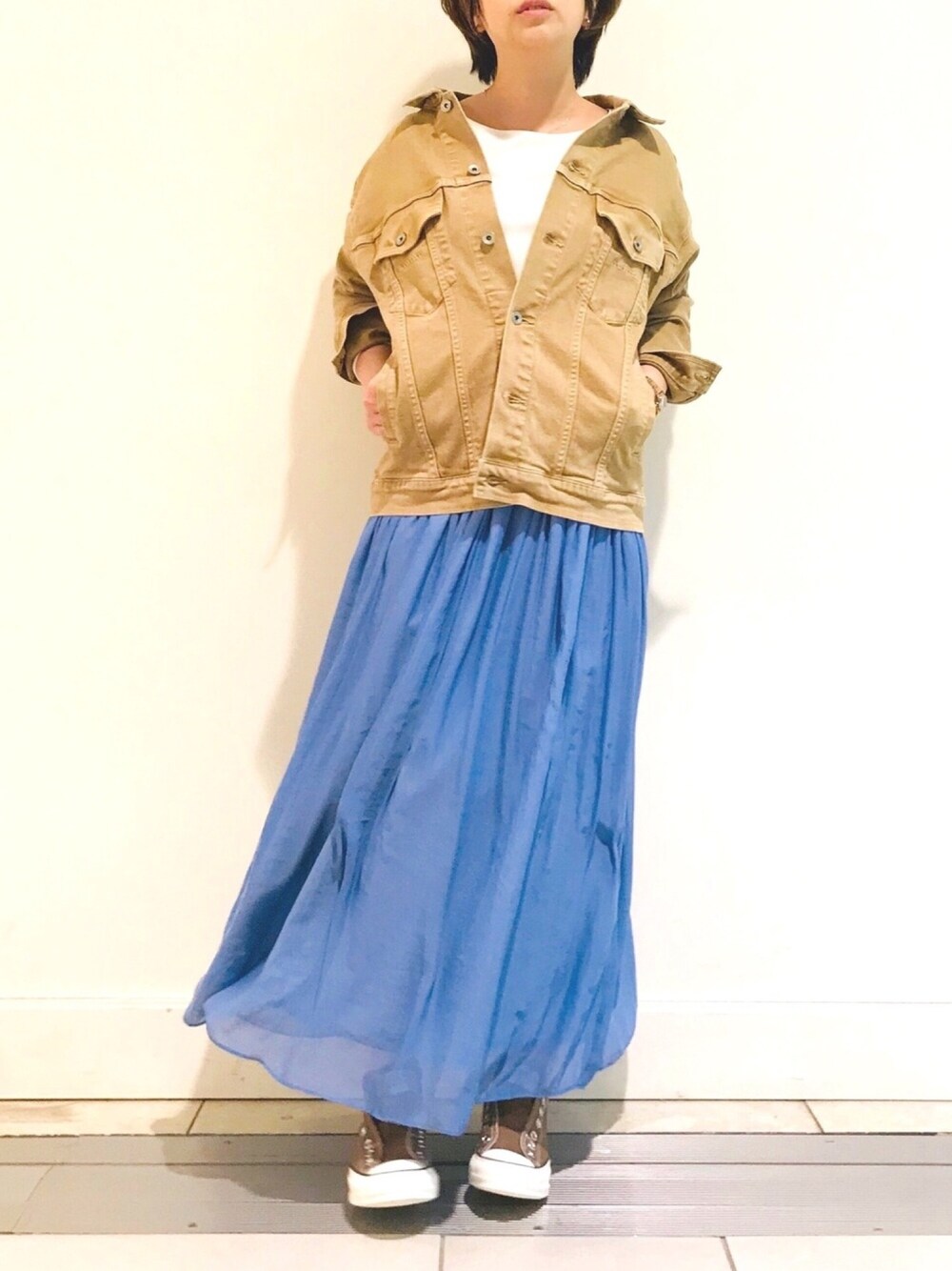 ヤヌークのGジャンをメインにスカート合わせで、大人カジュアルスタイル✨ キレイカラースカートで、春っぽく🌸