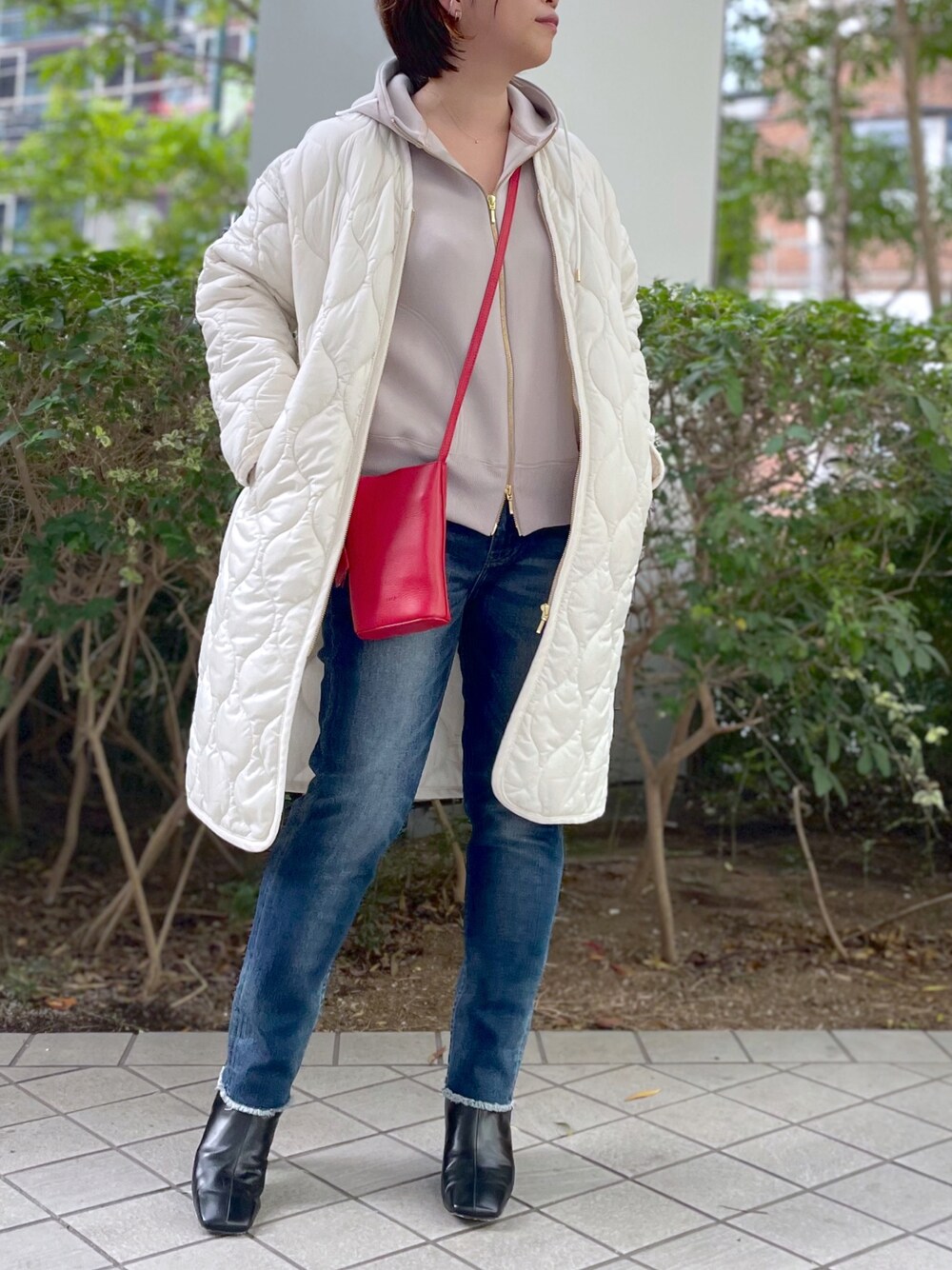 パーカーはスッキリシルエットなので、コートを重ねてももたつきもないです⭐️ そしてキルティングコートはとても軽く、ポケットが沢山あるので、ちょっと近所へお出掛け!にも便利なアウターです♪