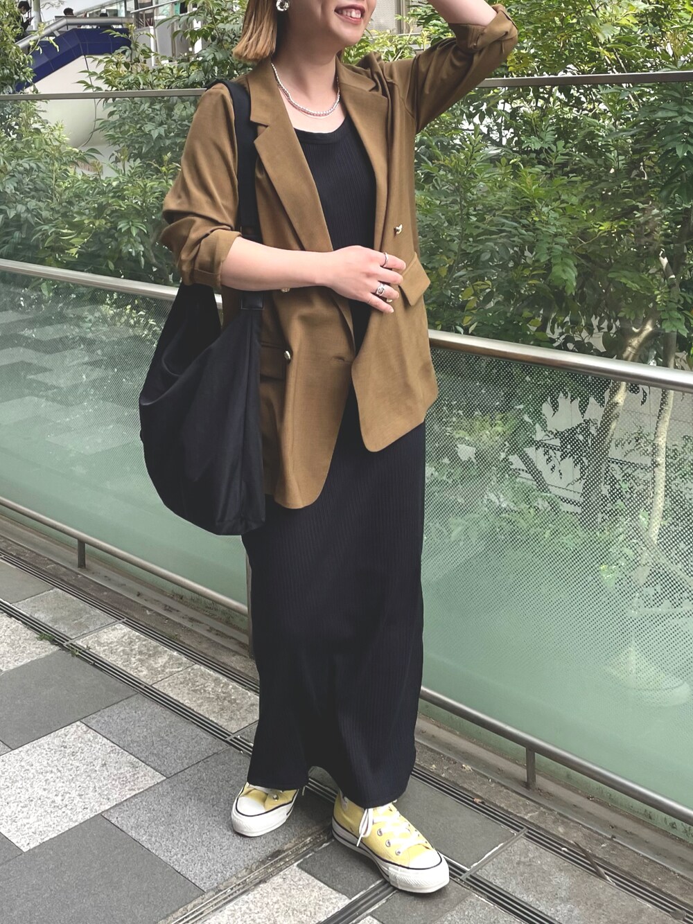スニーカー合わせでラフにコーディネート👍 ワンピースはリブなので伸縮性があって、ラクに着ていただけます!ご旅行とかにも便利かと🌺 バックも軽くて、大容量✨