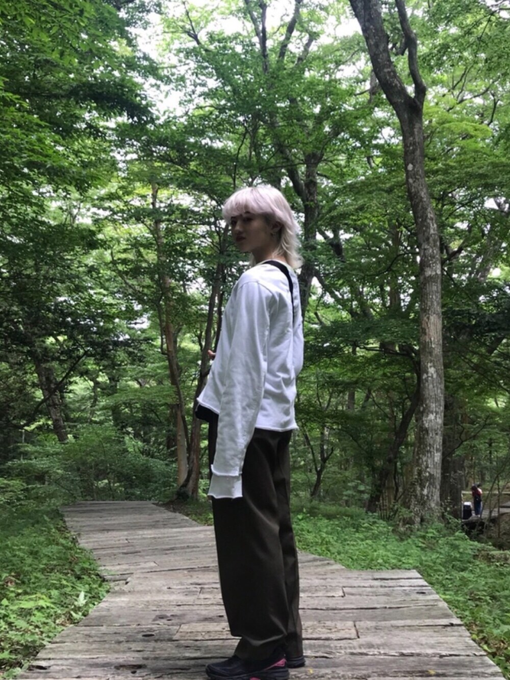 faceのlayered sweatと シルエットが綺麗なスラックスを。 静岡の美術館に行った時のスタイリング。上着はロッカーにいれてました...。