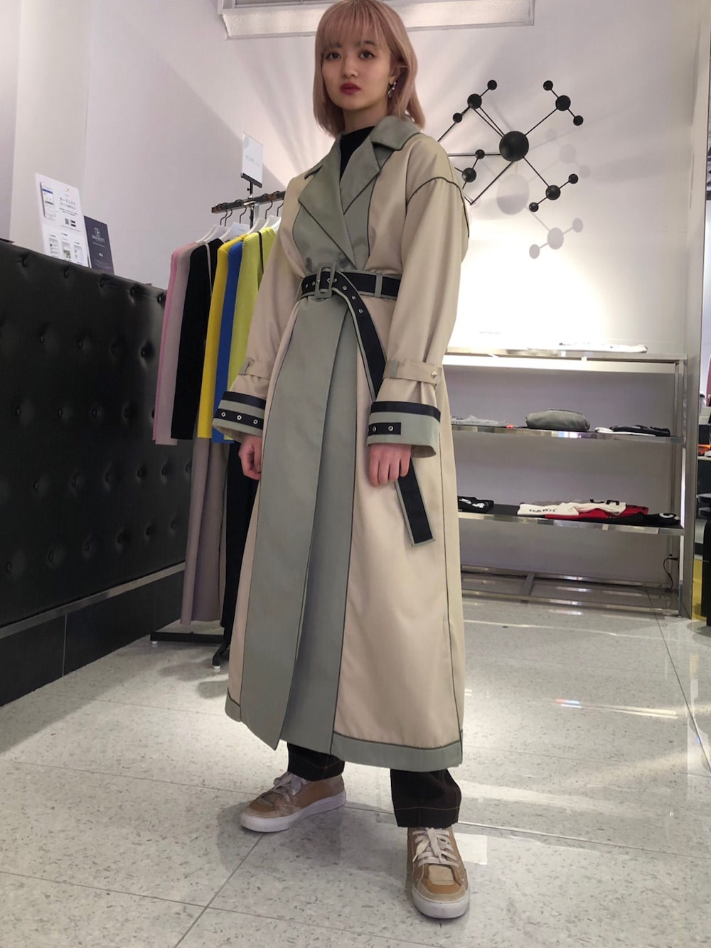 ameriとjointworksの別注コート に合わせてパンツと靴のトーンを落として 春らしいスタイリングに。