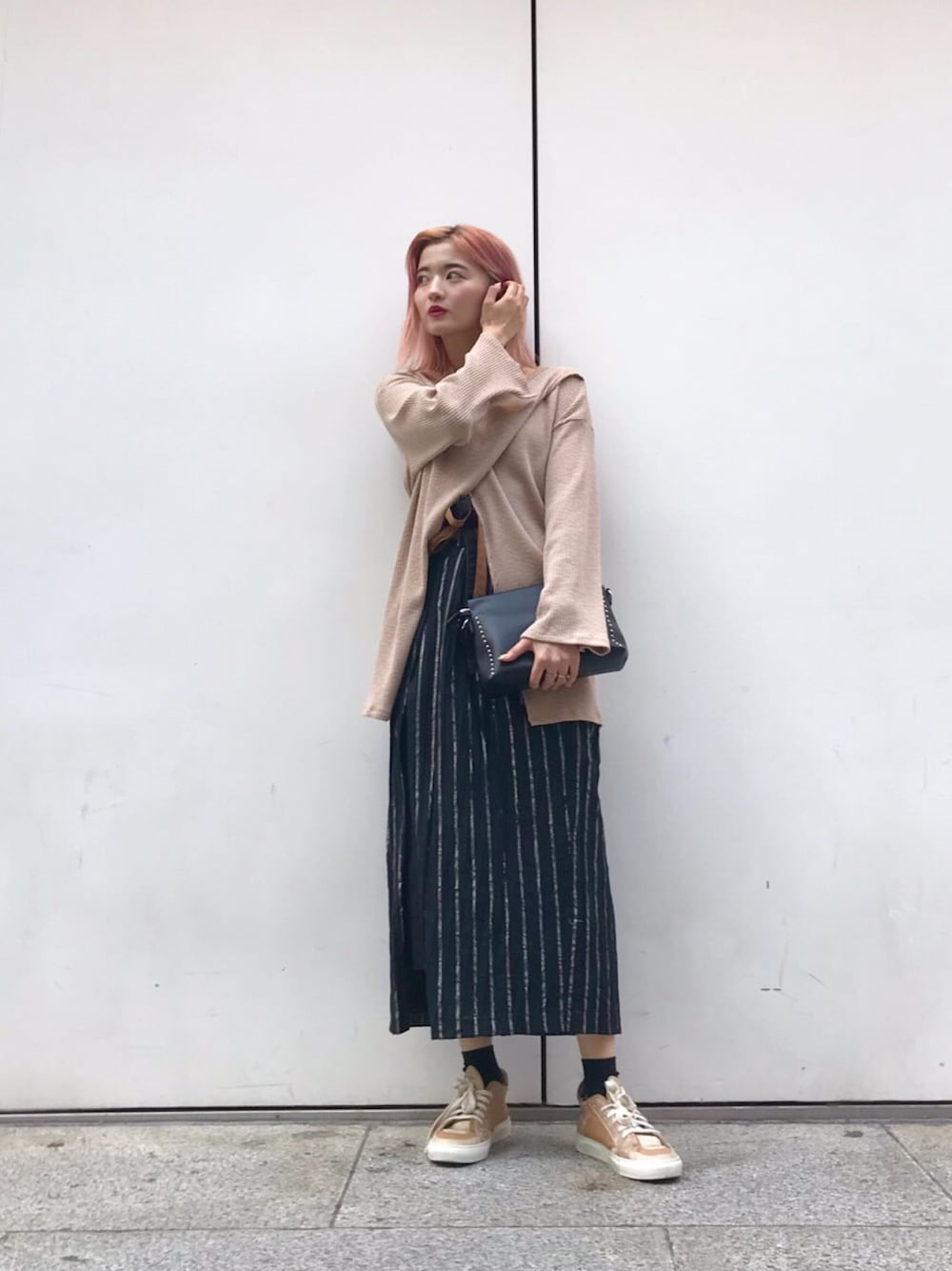 beige × black ベージュの洋服は甘くなりすぎないようにスニーカーと合わせるのが好きです