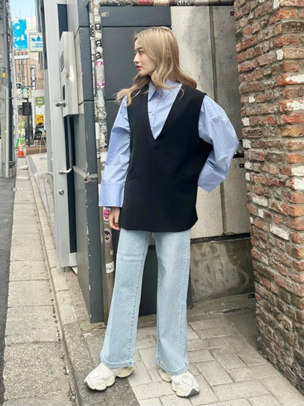 ベストとレイヤードして、袖元のデザインが映えるようにスタイリング!