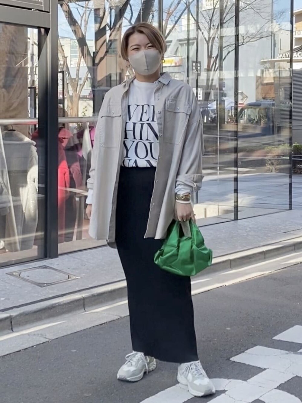 定番だけど、やっぱりかわいいロゴTシャツ!羽織のグレーシャツも今の気分にピッタリ!