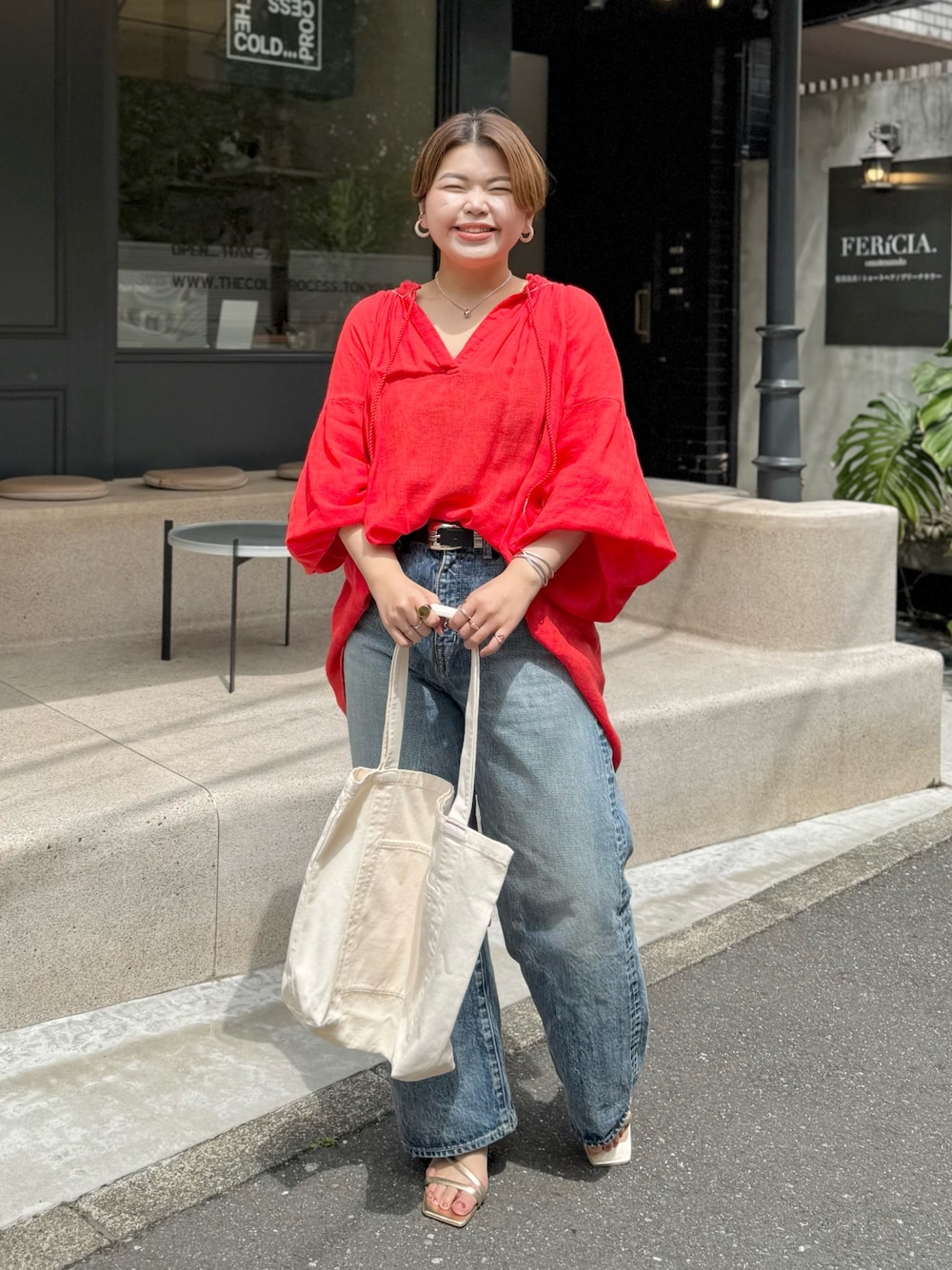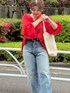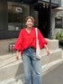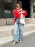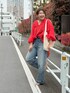 デニムに着るだけで着映え抜群! ニースのブラウス! この時期の赤は華やかに着れて、コーデのアクセントになる!