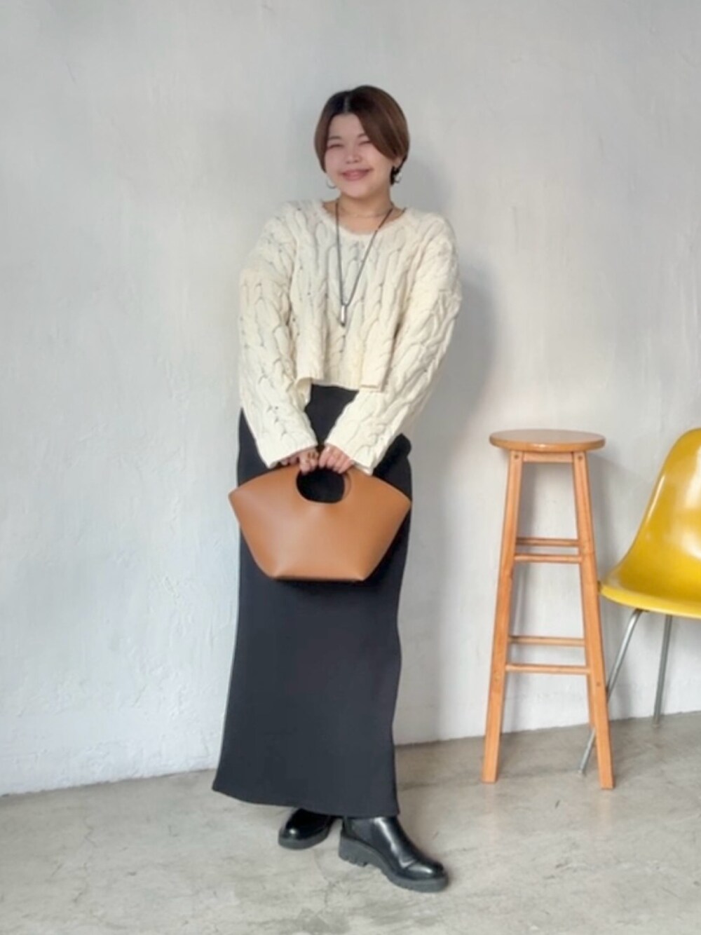 asuka.k(RIVE DROITE本部)のニット/セーター「【大人のこなれ感を演出】フリンジネックケーブルニット」を使ったコーディネート