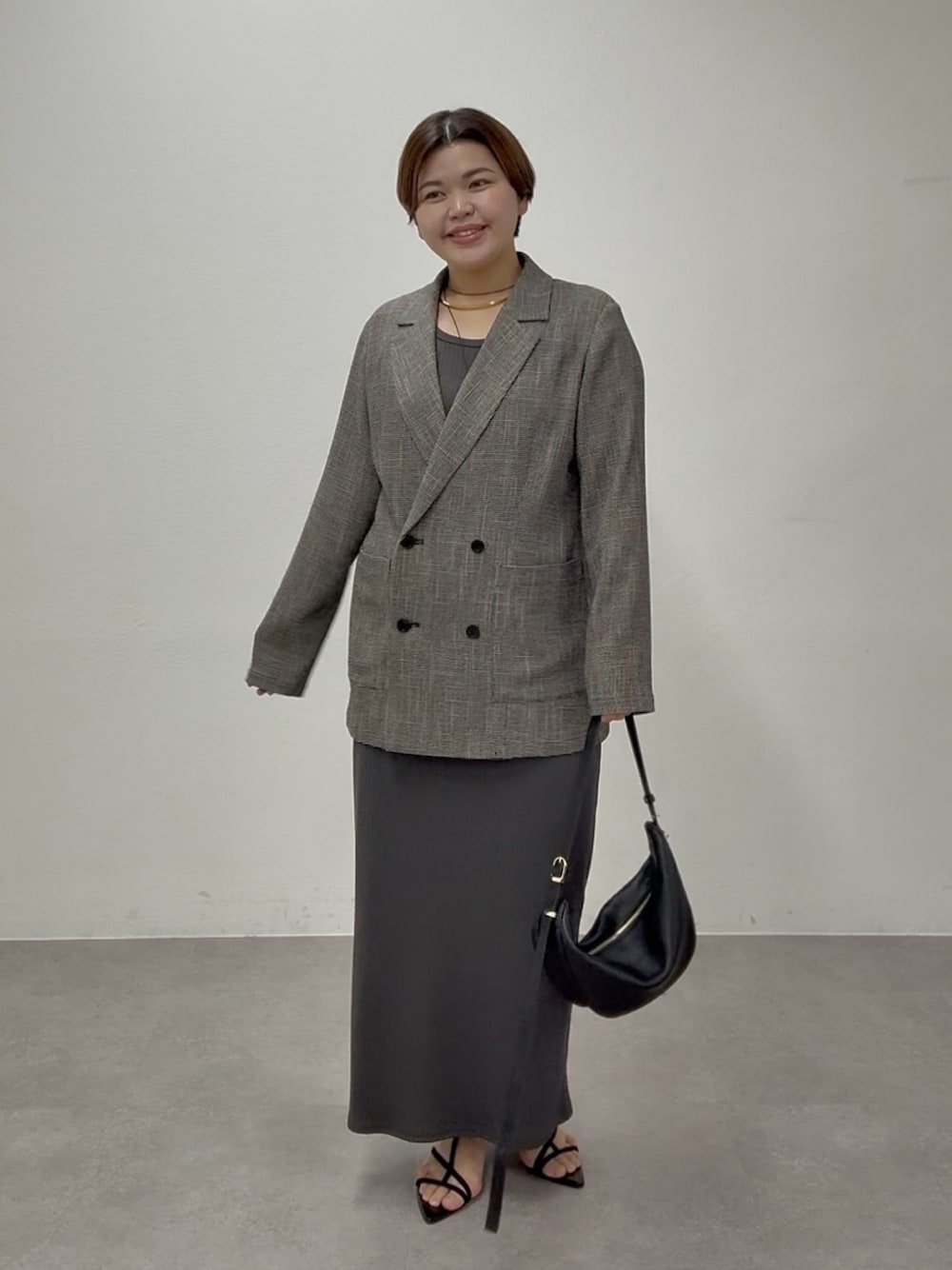 ワンピースとジャケットの王道コーデ! ジャケットの前を閉めて、ゆるっと着るのもこなれ感が出てオススメ!
