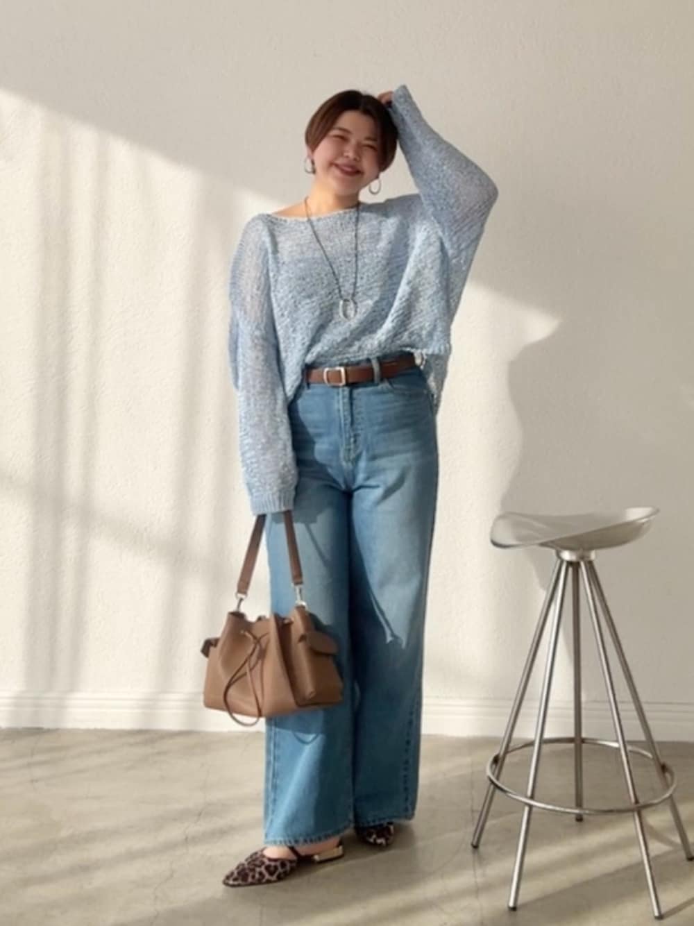 ブルー×ブルーの爽やかコーデ! ブラウンの小物でこなれ感をプラス