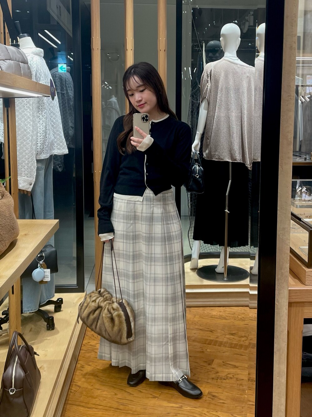 レイヤード風のデザインがオシャレなコンパクト カーディガン。 さらっとした肌触りなので、今の時期から長く着ていただけます◎ スカートは38サイズ着用 秋におすすめなシアーチェックスカート。 丈感がしっかりめのタイプなので、子供っぽくならずにお召頂けます!