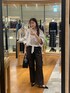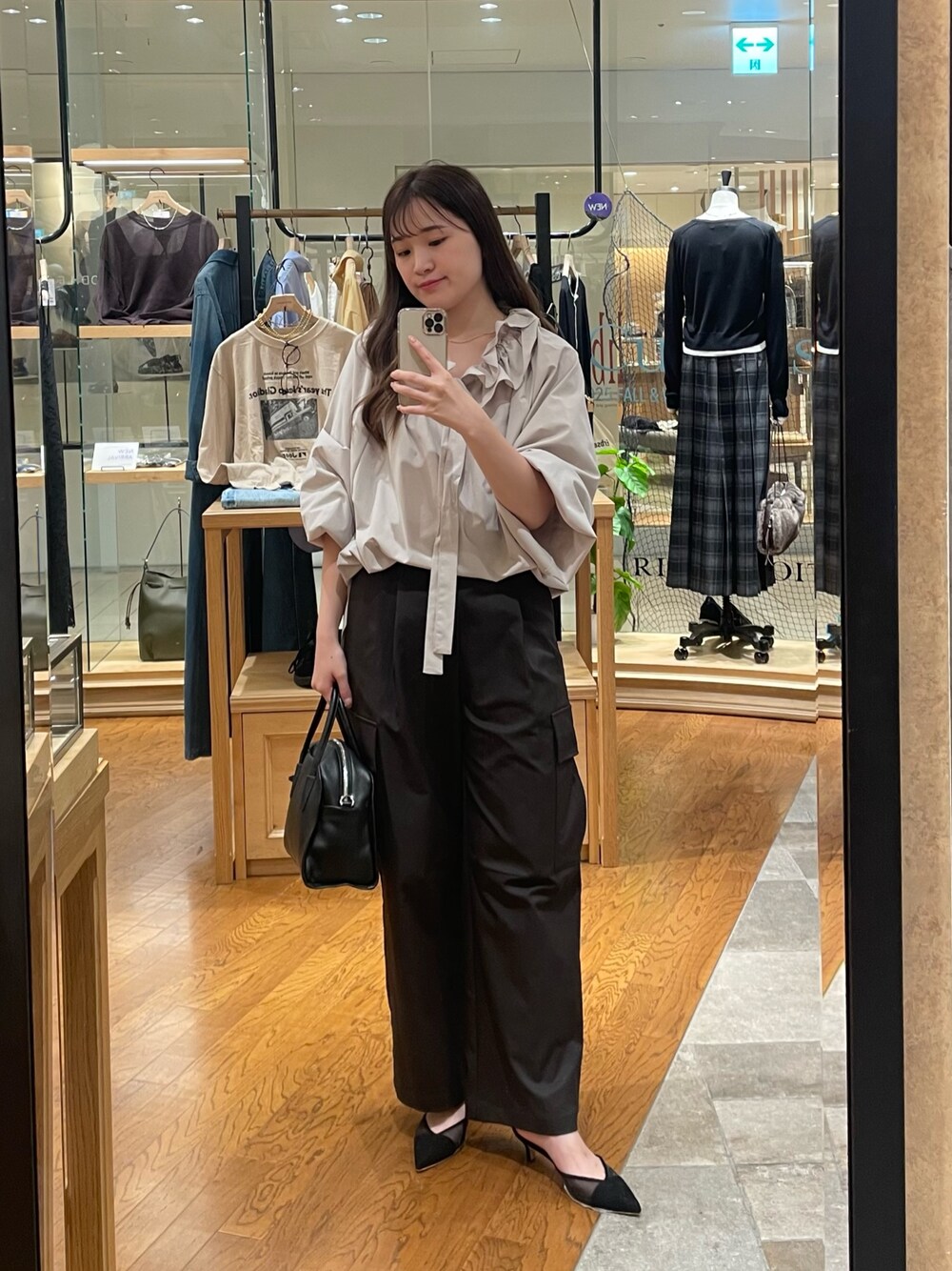 襟元が華やかなフリルカラーブラウス。 お好みでギャザーの加減を調節ができるので、雰囲気を変えて着ていただけます! 袖口がまくれるのも、嬉しいポイントです。 袖ゴムなので、今の時期から秋まで長く着れます! パンツは36サイズを着用しております