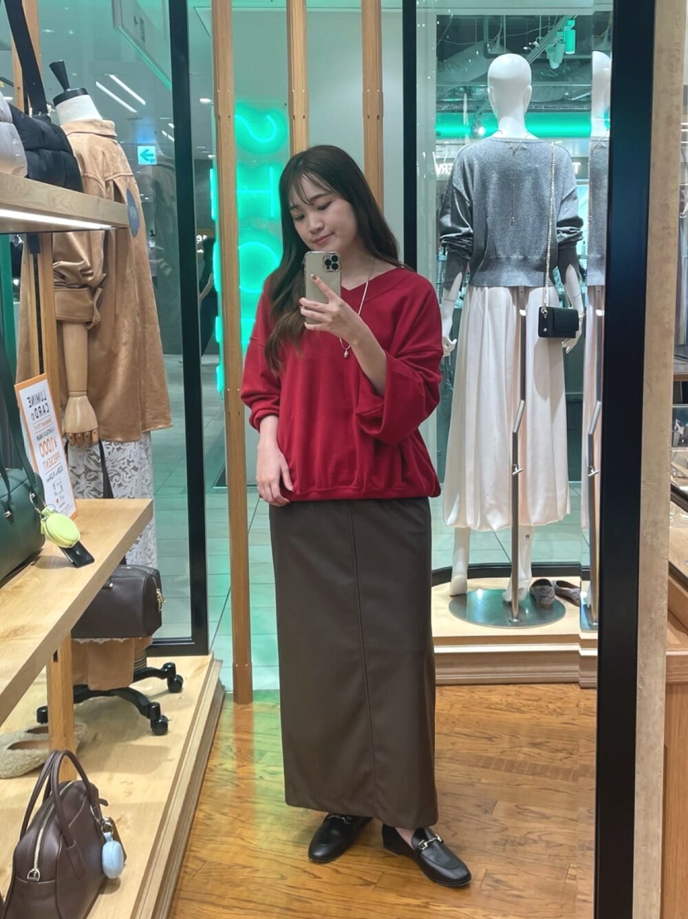 レッドxブラウンの秋らしいコーディネート。 スウェットは前後2wayで着用でき、少し肩を落として着ていただくのもおすすめ! 薄手なので、長い時期で着ていただけそうです◎スカートさ38サイズ着用 伸縮性があり、履き心地がいい合皮スカートです。 ブラウスやジャケットを合わせて綺麗めなコーディネートも素敵です!