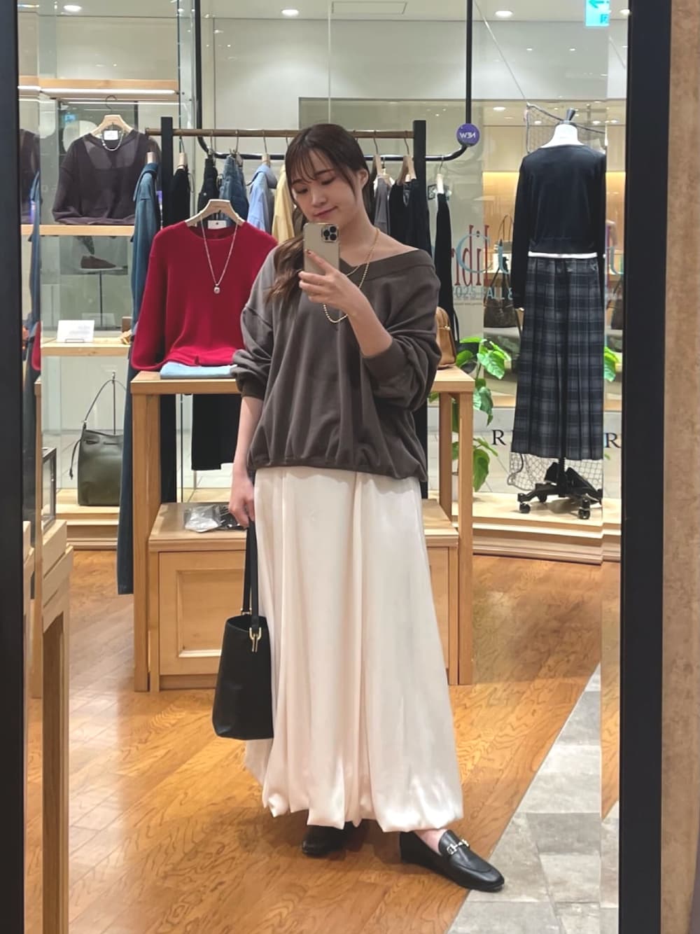 前後2wayで着ていただけるスウェット。 片方の肩を少しずらしてワンショルで着るのも素敵です! 薄手で柔らかい生地なのでカジュアルになりすぎず、女性らしい印象に。今年らしいブラウンカラーですが濃すぎないのも使いやすいです! スカート 38サイズ着用 光沢感のあるサテン素材が綺麗なバルーンスカート。落ち感があり、腰回りにボリュームが出過ぎないのできれいに見えます。 ブーツやスニーカー合わせもおすすめです。