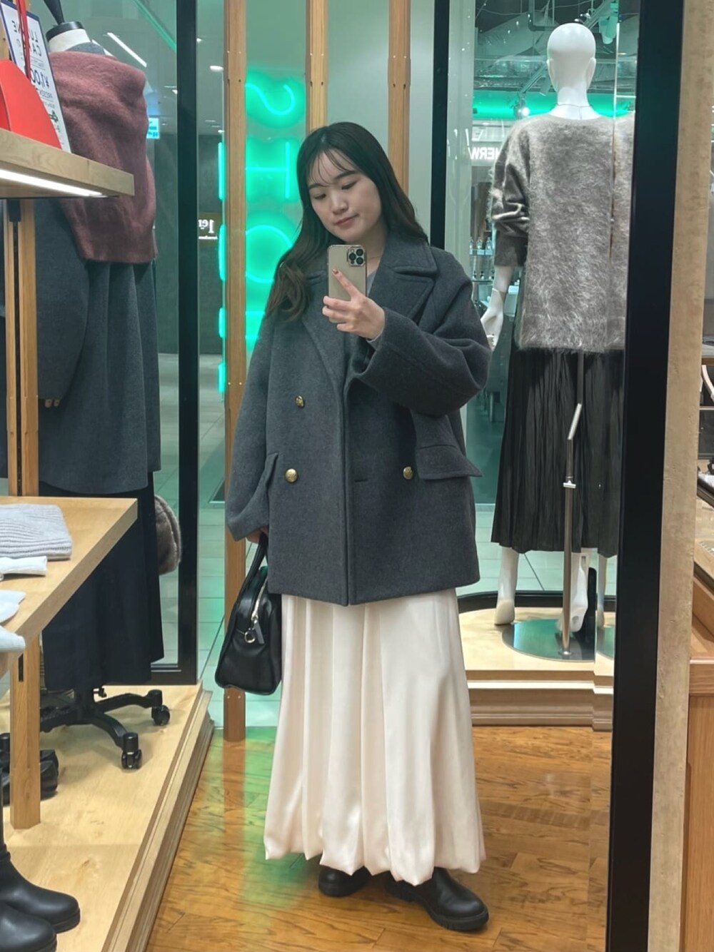 定番人気のPコート、新色のグレー36サイズを着用してみました! 裏地付きなのにとっても軽く、どんなスタイリングにも合わせやすいデザイン。 腰周りが隠れるので、パンツスタイルでもバランスが取りやすいです。