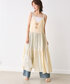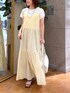 ・ワンピース 軽くて微光沢感のあるティアードのキャミドレスです。ボリュームたっぷりですが、シルク混なので繊細で柔らかな動きが出る1着となっております。デニムなどとレイヤードしても着用いただけます。肩紐で着丈の調整ができ、私だと踵が少し見えるくらいです。 ・Tシャツ 汗じみ防止加工の施された天竺素材を使用したカットソーです。フレンチスリーブが、二の腕の気になる部分もカバーしてくれます。しっかり目の天竺素材で体のラインを拾いづらく、1枚着としてもおすすめです。