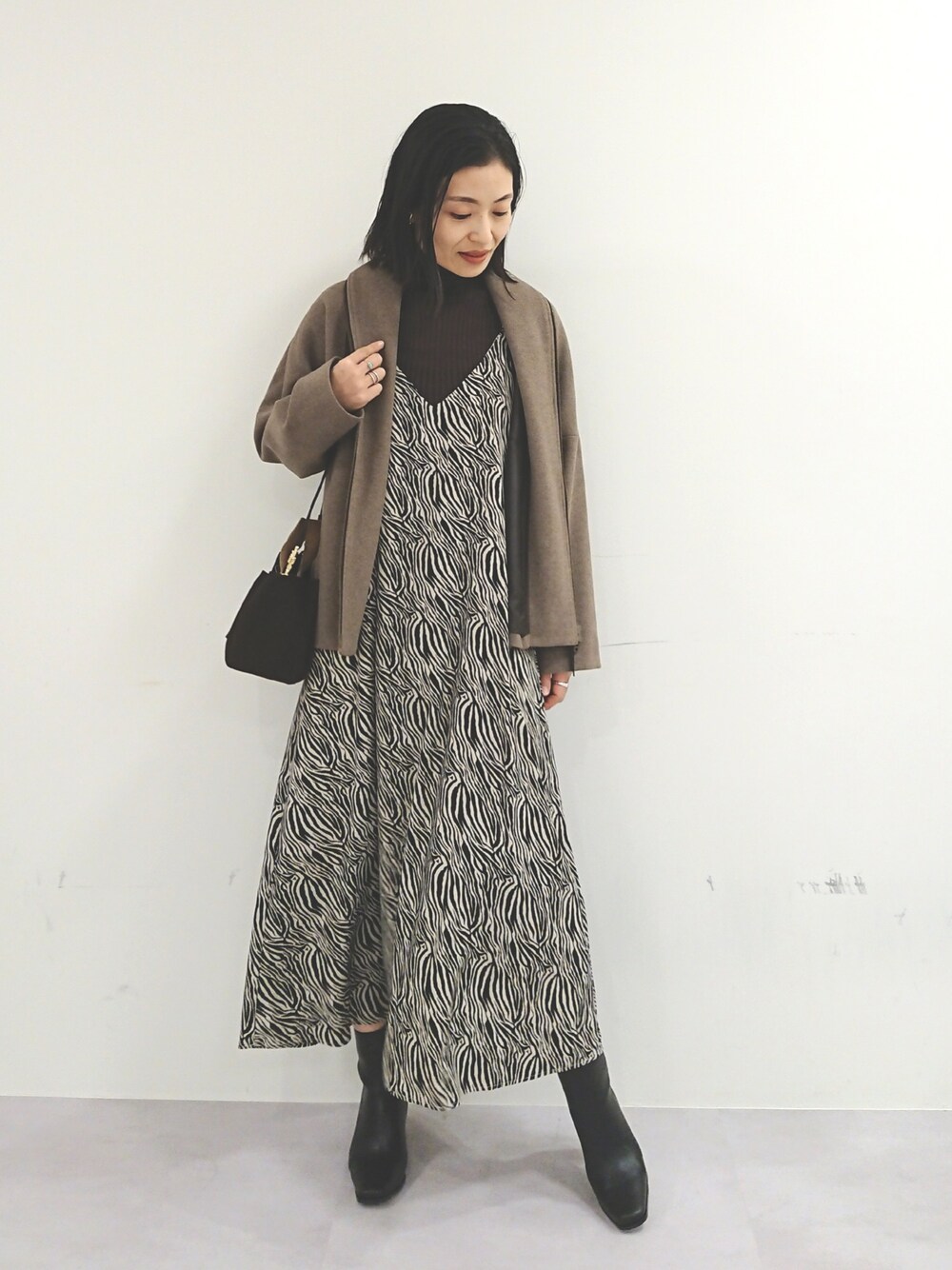 ゼブラ柄で辛口ワンピスタイルに。 ブラウン✖️ブラックのダークトーンでまとめて、柄アイテムも取り入れやすく。 インナーをTシャツやブラウスなど、着回しが楽しめます!