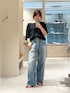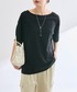 Tシャツとデニムなカジュアルなスタイリングを女性らしくスタイリング◎ オープンネックTシャツは、襟元がボートネックになっており私は肩を落として着用してます。 袖丈も長めで、安心して着用できるところと、女性らしく着られるTシャツという点でとっても推しポイントです。 そしてとにかく涼しいです!