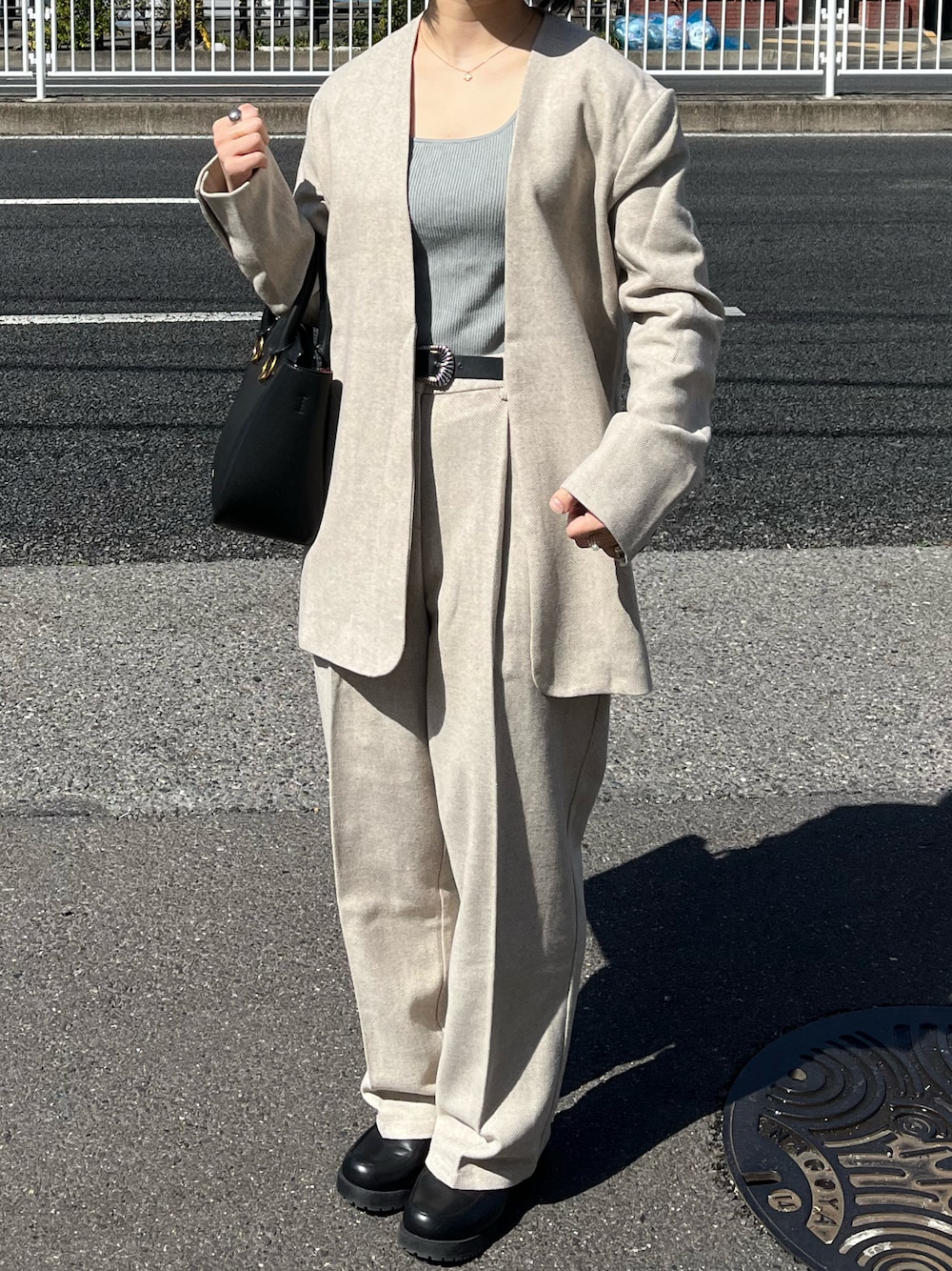 re@のノーカラージャケット「ノーカラーセットアップジャケット」を使ったコーディネート