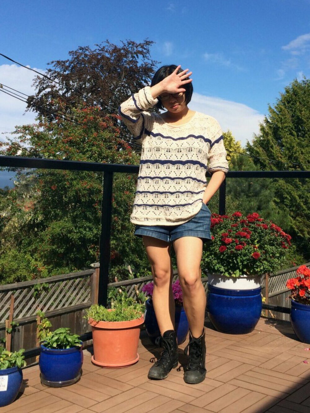 Shelleyのニット/セーター「fishbone knit in blue scallop stripe」を使ったコーディネート