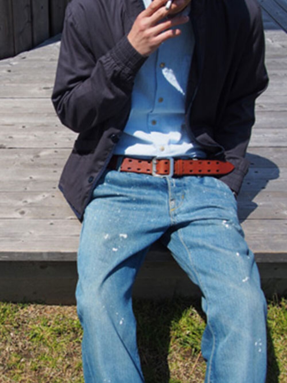 レザーアイテム専門店「REALETH(リアレス)」のベルト「Levi's リーバイス ベルト:デニムは勿論、どんなパンツにも合わせ易いブラック。」を使ったコーディネート