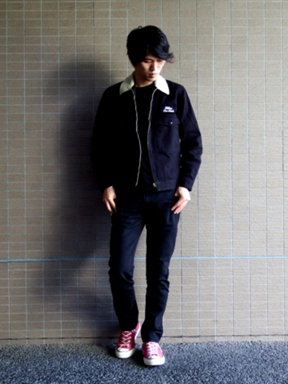 ブラック系のブルゾンを着用したメンズの秋コーディネートの1枚目の写真