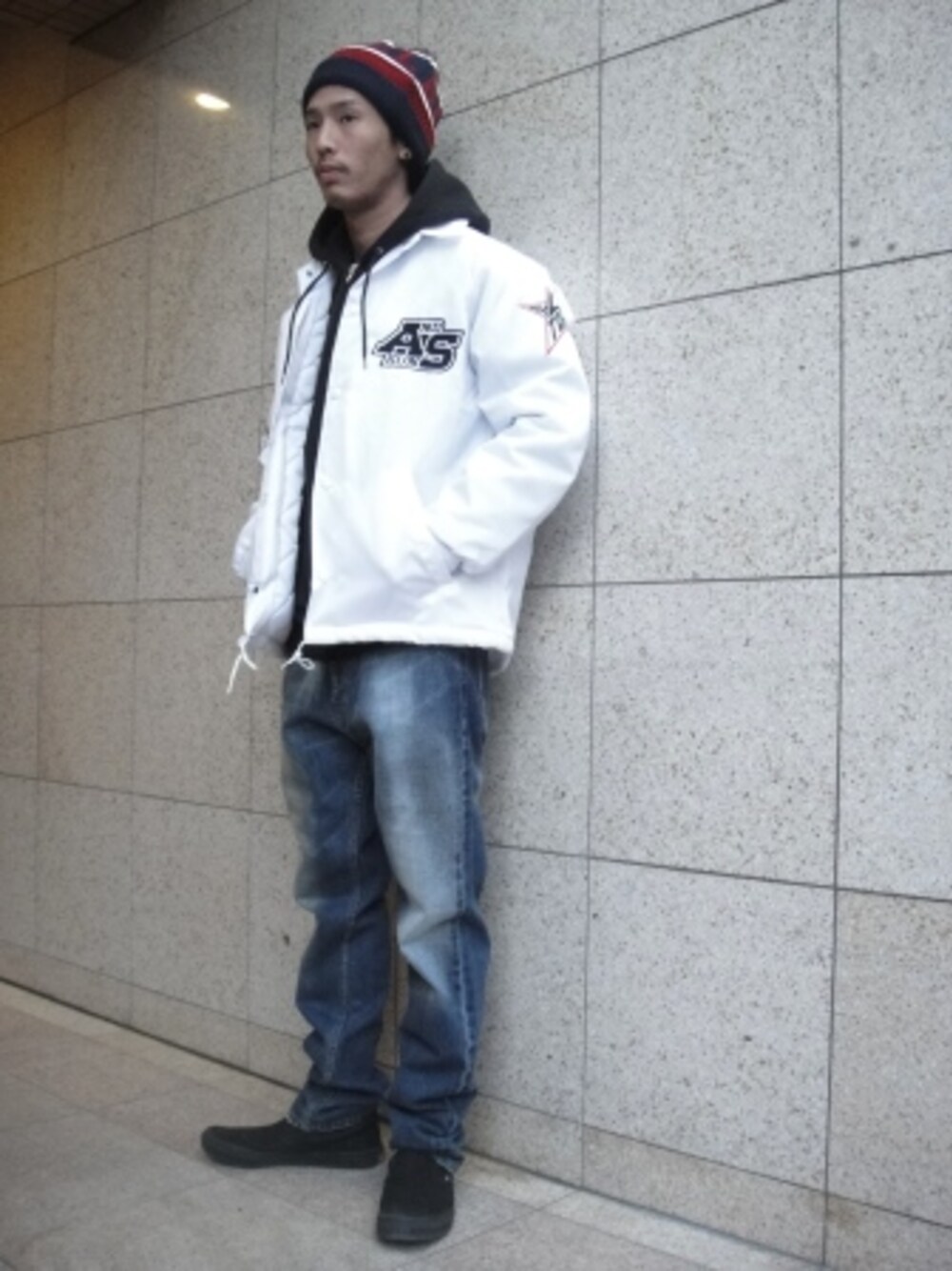 コーチジャケットはワンサイズ上で着用しています。 パーカーにコーチジャケット。。。。 鉄板ですよね。 勿論外出先ではフードを被りたいですね。 頭は、季節感を出してニットキャップを着用。 STAFF Blogでもご紹介しております。 【RAUGH of life STAFF Blog】 http://raugh.exblog.jp/ 通信販売もご利用可能です。 【RAUGH of life By Real jam STORE WEB SITE】 http://www.real-jam.jp