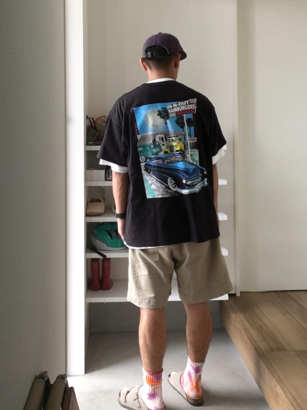 アメリカのハンバーガー店のTシャツ。 アイテムの存在は知っていたものの 特別視はしていなかった。 が、 アウトドアショップの店員が着ているのを見て、わぁー良いーとなり買ったやつ。 で、 キャンプにも着ていったやつ。 家に届いた時はチーズくさかったので すぐに洗濯。 あれはアメリカのニオイだったのか?