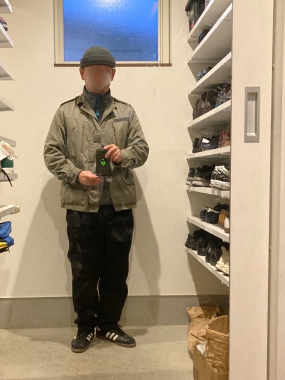 古着のフリースに めちゃくちゃ久しぶりに着た、 ミリタリージャケット。 車移動なので 適当な防寒対策。