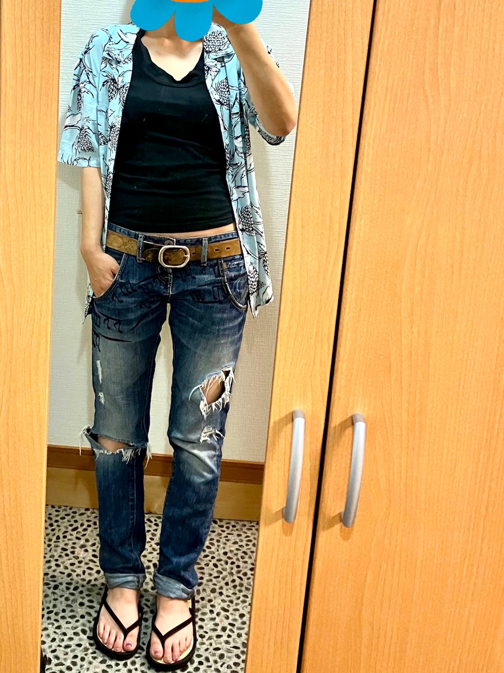 暑いんですが、アロハシャツ的なやつは…まだ早い…?? サンダルは、こだわりの畳サンダルです。 夏は畳サンダルです…。畳…