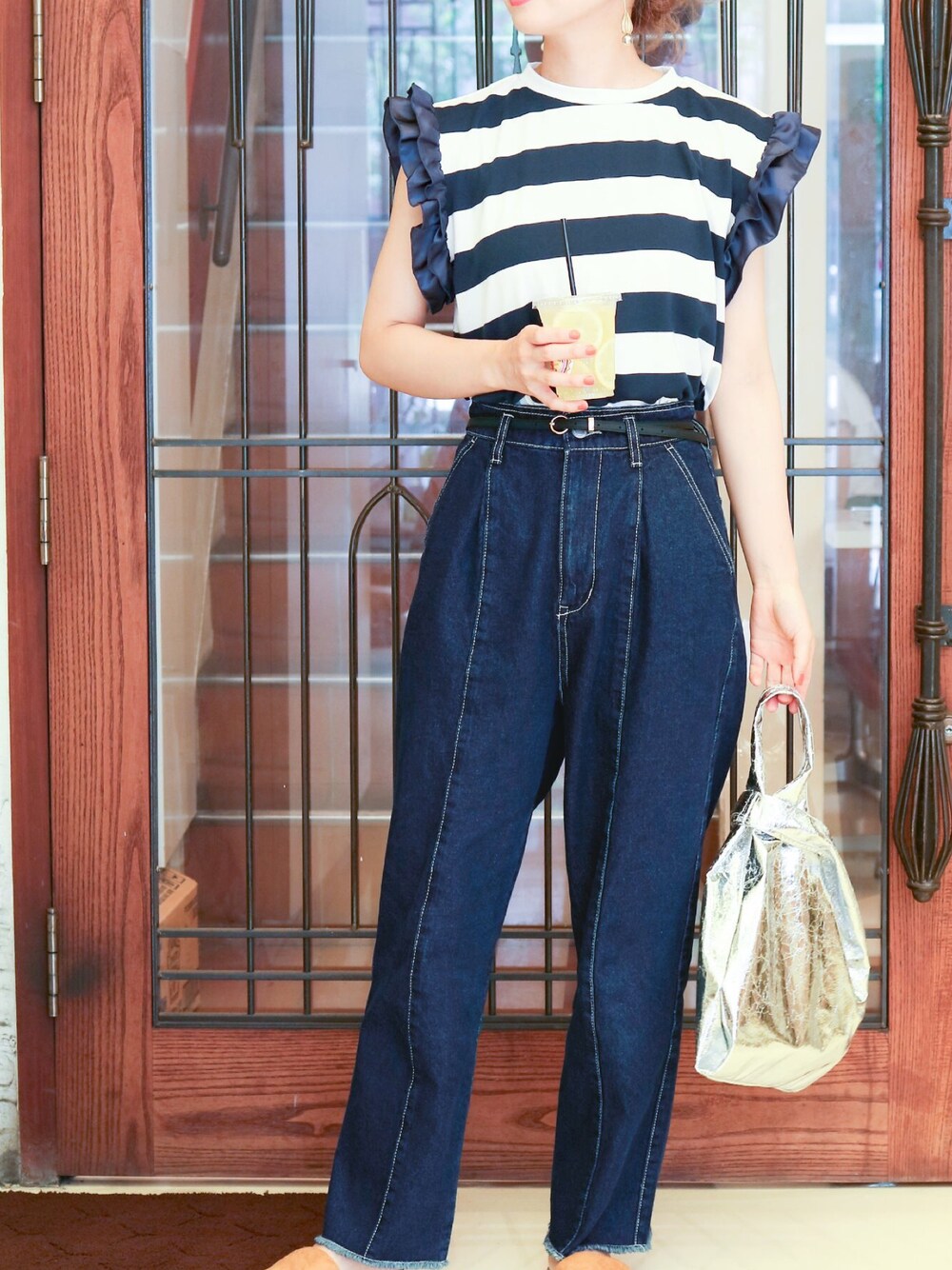 recastaff(reca)のTシャツ/カットソー「ゆるてろ涼しげ素材◇大人可愛い ショルダーフリル 半袖 ボーダーカットソー」を使ったコーディネート