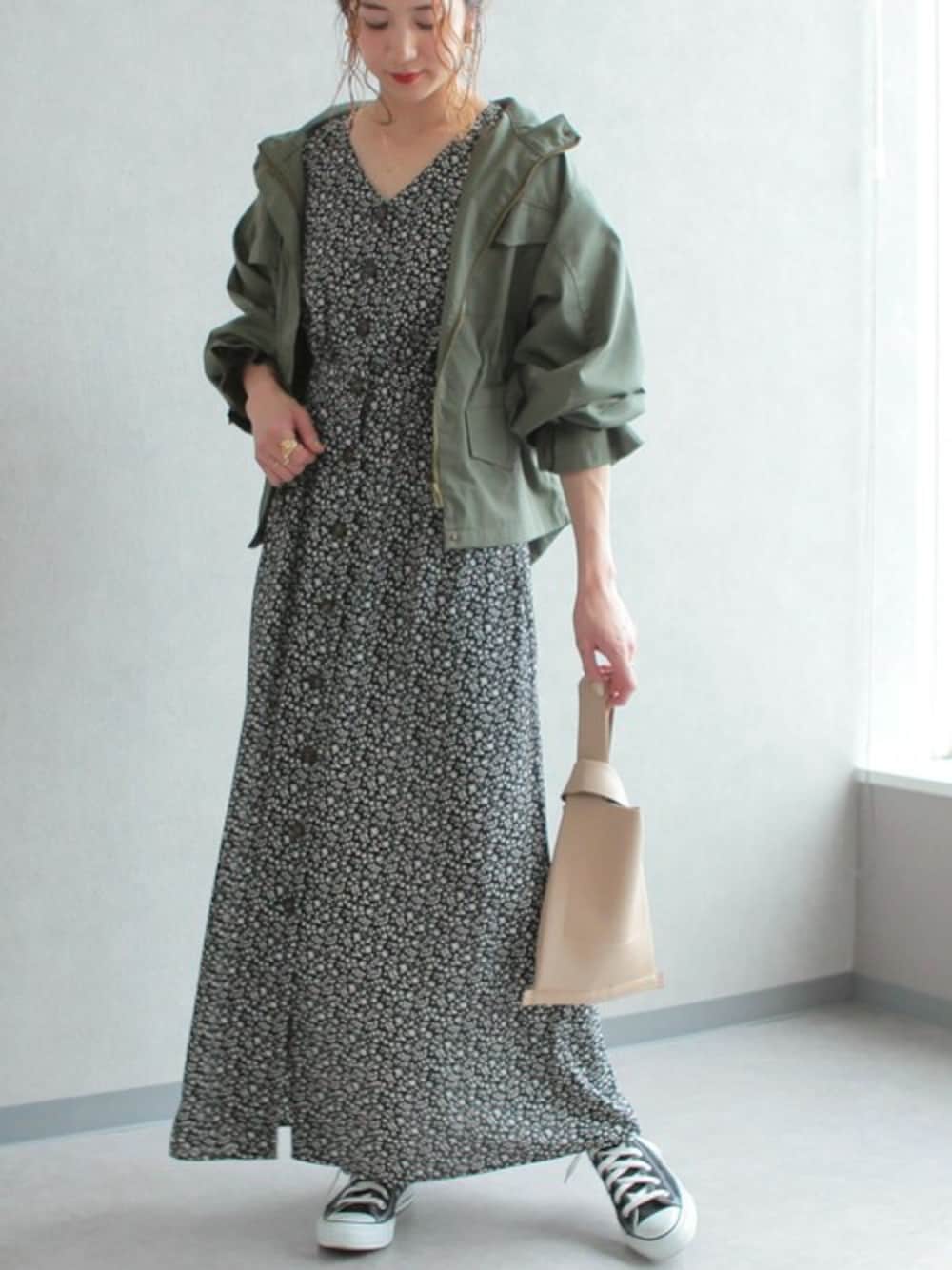 recastaff(reca)のTシャツ/カットソー「前ボタンVネック小花柄マキシ丈ワンピース」を使ったコーディネート