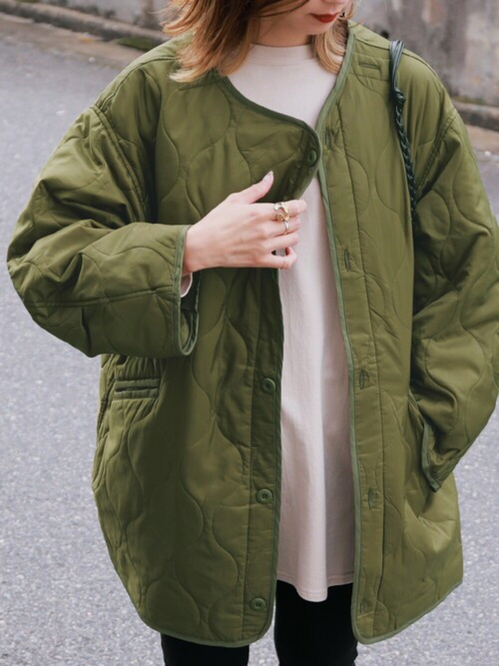 〈NEW ARRIVAL〉 オーバーサイズのキルティングコートです♡ 今からの季節、ニットなどの厚手のトップスとも相性良し◎ フロントボタンがサイドにあるので、閉めても可愛く着こなせちゃいます♪ ‘‘ビッグシルエットキルティング コート‘‘ ¥7,260-