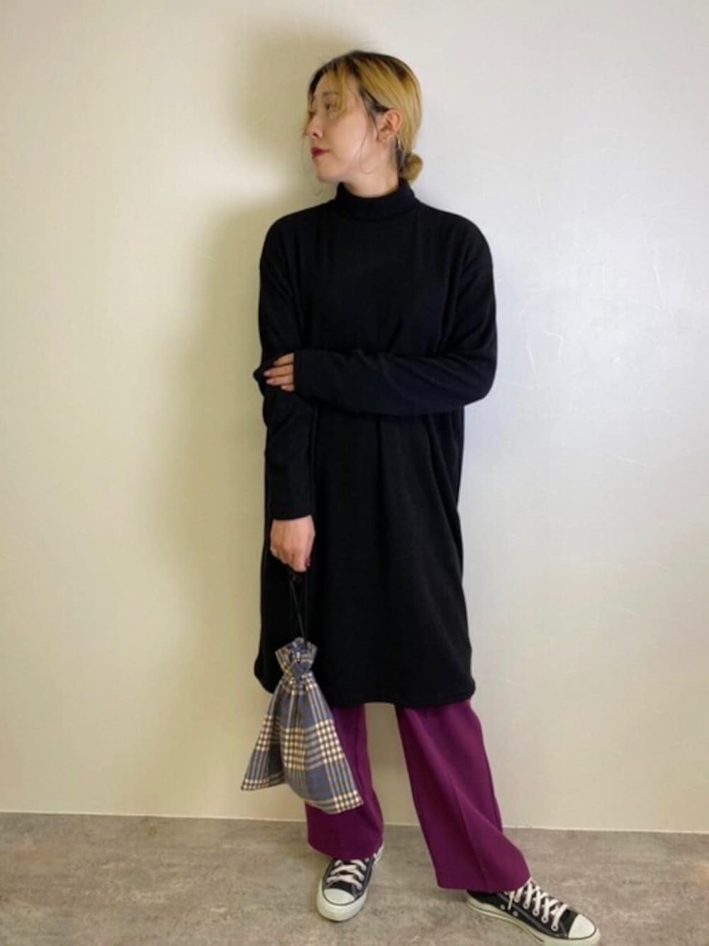 〈staff styling〉 ブラックワンピースにパキッとしたパープルのパンツを合わせることで 重たい雰囲気にならずスッキリとまとまったコーデに◎ ポイントで差し色を入れることでコーデに幅が出ます! ‘‘シンプルタートルワンピース‘‘ ¥3,366-タイムセール開催中👀 ‘‘チェック柄 巾着バッグ‘‘ ¥2,200-